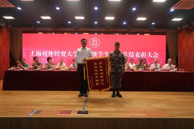 殷耀代表学校向部队赠送锦旗,表达了学校对部队支持我校军训工作的感谢,鲍俊成代表部队接受锦旗。