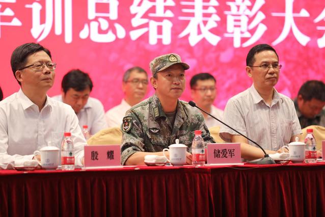 储爱军代表承训部队对军训工作取得完满成功表示热烈祝贺,对全体参训学生的成长、进步表示充分肯定,向始终关心军民共建,高度重视军训工作的学校党委领导、全体教职工表示诚挚的敬意。他回顾了参训以来同学们刻苦训练的过程,通过军事训练、国防教育、团队协塑造了一支纪律严明、军姿挺拔的队伍,涵养了同学们的爱国情怀和高尚情操。他希望同学们能够像军人一样铮铮铁骨、朗朗硬气,以良好的精神面貌和意志品质勇敢面对、攻坚克难,始终自强自立、昂扬向上,为建设中华民族伟大复兴的中国梦而努力奋斗。