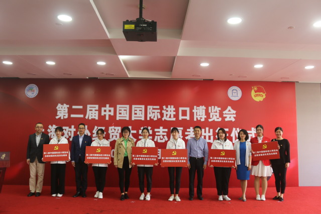 与会领导分别为第二届中国国际进口博览会志愿者党员先锋岗授牌。