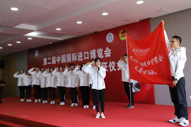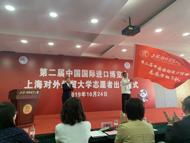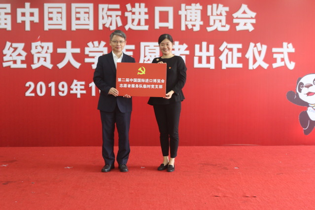 出征仪式上,祁明为第二届中国国际进口博览会志愿者临时党支部授牌,为第二届中国国际进口博览会上海对外经贸大学志愿者服务队授旗。