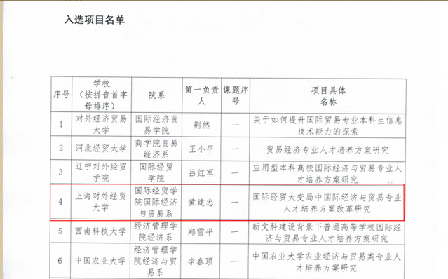 近日,经教育部高等学校经济与贸易类专业教学指导委员会组织专家评审,我校国际经济与贸易专业申报的“国际经贸大变局中国际经济与贸易专业人才培养方案改革研究”、“建设贸易强国背景下《中国对外贸易》金课建设研究” 和“建设贸易强国背景下《国际贸易实务》金课建设研究” 3个项目入选“经济与贸易类专业核心课程金课建设研究”资助。此次发布的研究课题是教育部经济与贸易类专业教学指导委员会首批“金课”建设项目,来自全国28所本科院校的32个项目入选。