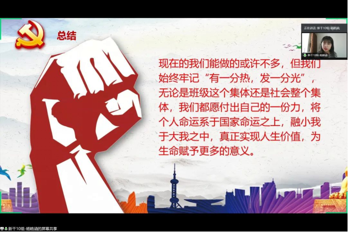 随后,新干班各组进行主题为“争做青年榜样,不负青春韶华”的小组展示。小组代表们从学习习近平总书记五四寄语入手,结合疫情下的青年担当、学生干部培训班的学习体悟,带来了精彩的展示,彰显了新时代青年干部们不负青春韶华、勇于担当时代使命的决心。