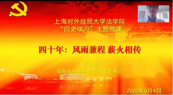 “全国党建工作样板支部”创建培育单位——法学院国际关系学系教工党支部书记王金强为2019级入党申请人开展以“四十年:风雨兼程,薪火相传”为主题的线上党课,近60名学生参加线上学习。王老师就“四史”学习的重要性展开论述,他建议同学们要“立足中国看世界,站在世界观中国”,主动学习中国的国情、文化和历史。