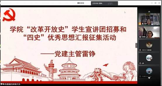 7月10日,学院邀请张鸿教授开展题为“改革开放四十周年”的“四史”首堂党课,拉开了“中国改革开放史”系列党课的序幕。同时,在广大优秀学生党员中招募“改革开放史”学生宣讲团成员,通过“送党课上门”为上海对外经贸大学附属学校、广富林街道和中小学等单位的党员群众讲述改革开放的故事。组织“四史”优秀思想汇报征集活动,鼓励学生围绕“四史”学习心得和感悟撰写思想汇报。