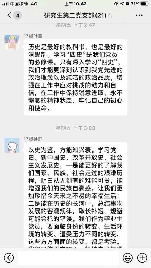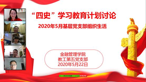 在疫情防控要求下,金融管理学院各学生党支部积极探索线上学习模式,充分利用微信群、腾讯会议、ZOOM平台等网络媒介,把“四史”学习教育放到“云”上,放在心上。