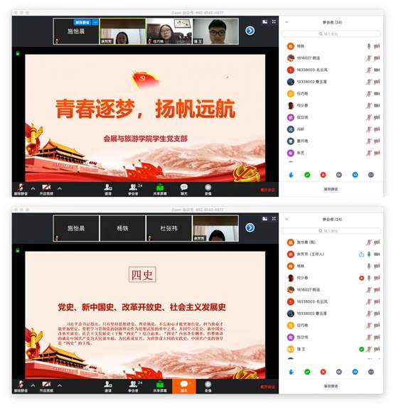 政治生日学“四史”,推动理论学习往深里走。旅游管理系党支部召开“重温党史故事,传承红色精神”主题党日活动,支部党员集体观看学习强国平台“四史”教育微党课之枫泾暴动、毛泽东为“松江经验”点赞等历史事件,在历史的学习中了解党的伟大,庆祝党的99岁生日,随后全体党员重温了入党誓词,共同度过一个难忘的集体政治生日。