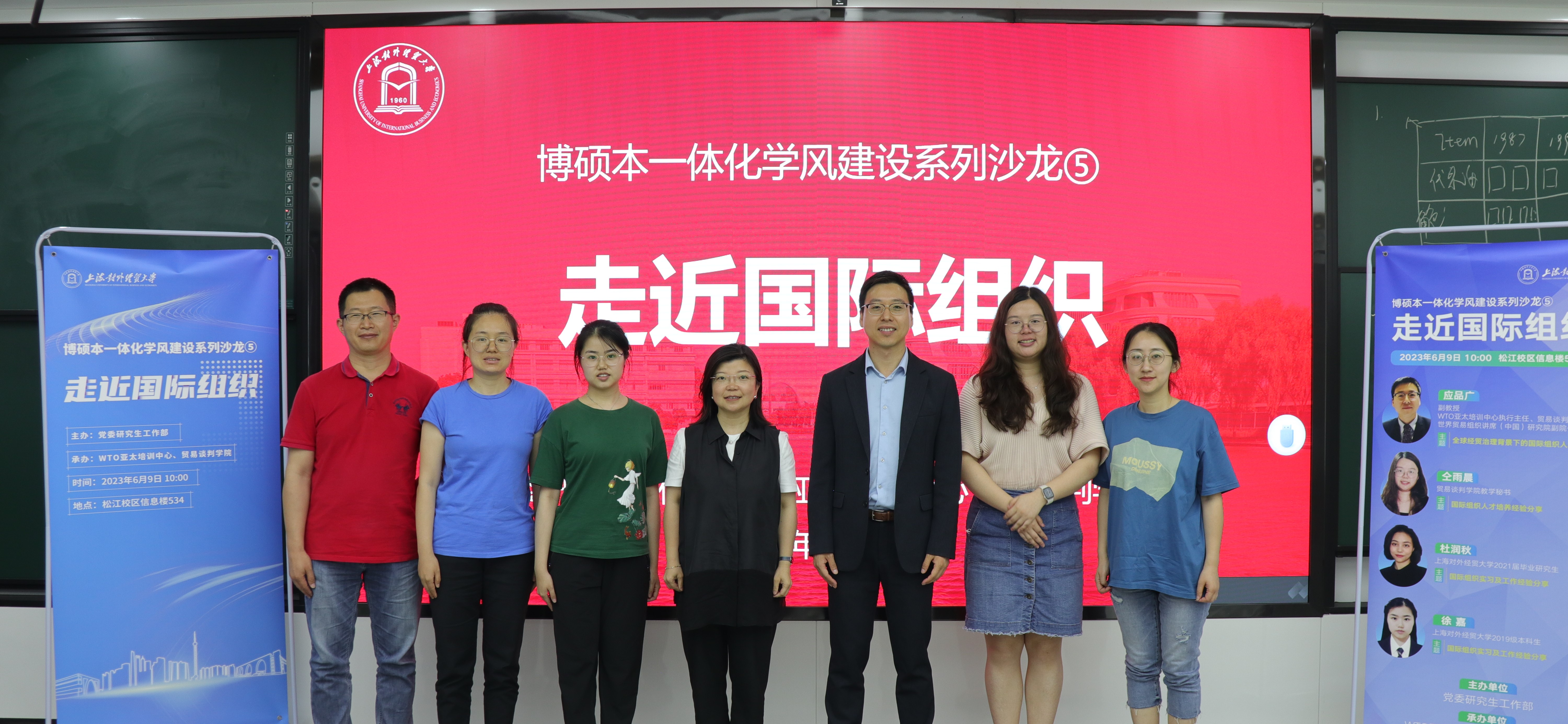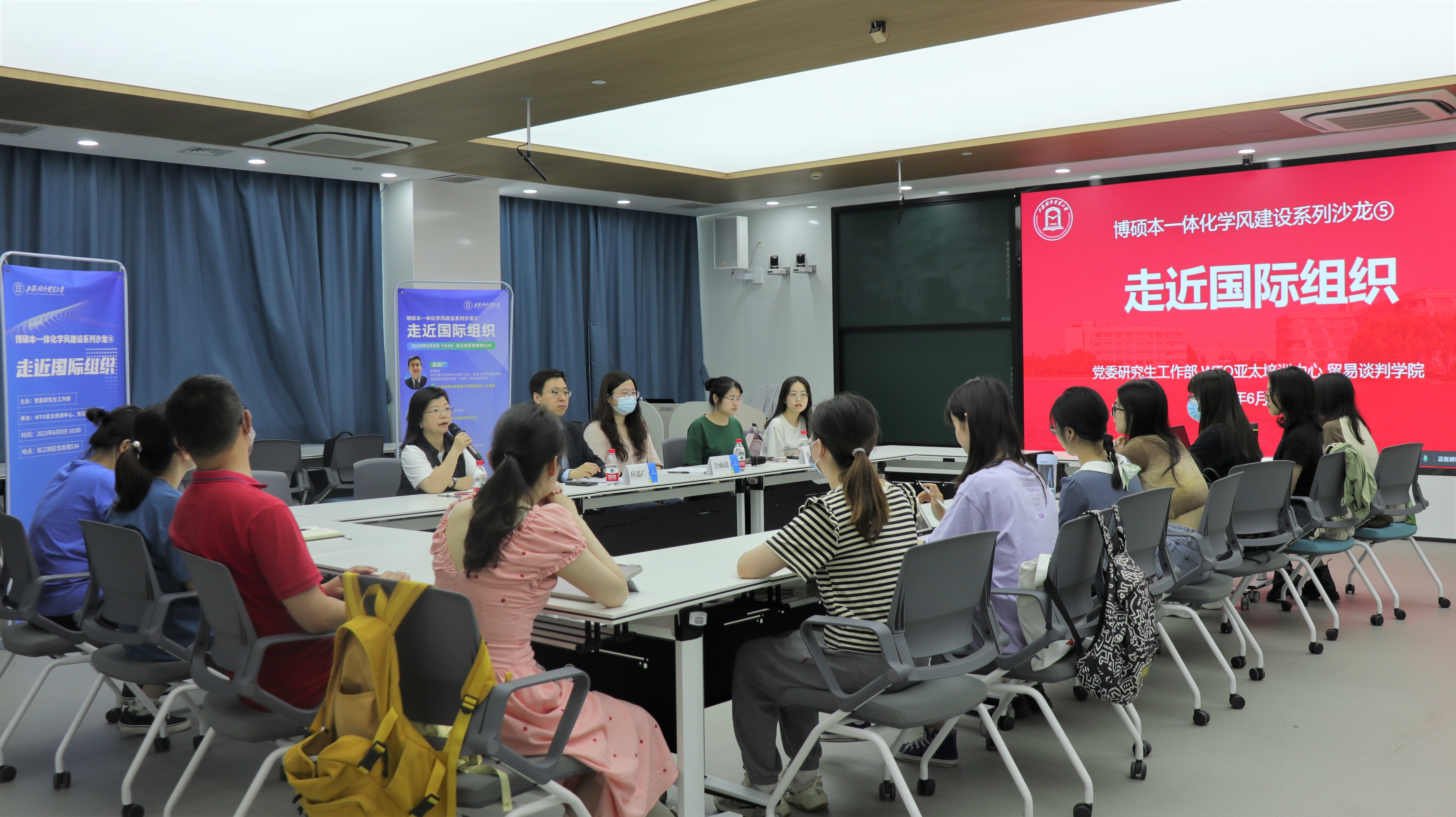 为紧密对接学校国际组织人才培养工作,拓宽学生在国际化视野下规划生涯发展的格局和思路,助力学生更高质量就业,6月9日下午,党委研究生工作部联合WTO亚太培训中心和贸易谈判学院共同举办“博硕本一体化学风建设系列沙龙⑤走近国际组织”师生面对面活动。WTO亚太培训中心执行主任、贸易谈判学院副院长应品广,贸易谈判学院教学秘书仝雨晨,国际组织实习学生代表杜润秋和徐嘉出席活动并作主题分享,活动由党委研工部副部长、研究生院副院长乔檀主持。