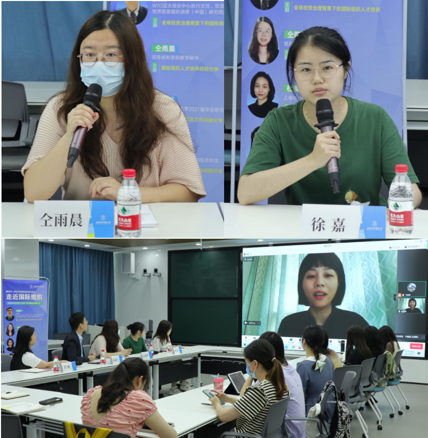 随后,仝雨晨介绍了教育部“高层次国际化人才培养创新实践项目”、境外实训项目以及“国际组织主题活动月”的相关内容;2019级本科生徐嘉分享了在联合国教育、科学及文化组织国际创意与可持续发展中心实习的经历以及参加学校高层次国际组织人才培养创新实践项目的体会;2021届毕业研究生杜润秋在线分享了自己在联合国亚洲及太平洋经济社会委员会贸易政策与贸易便利化部门实习的经历以及对学弟学妹的建议。