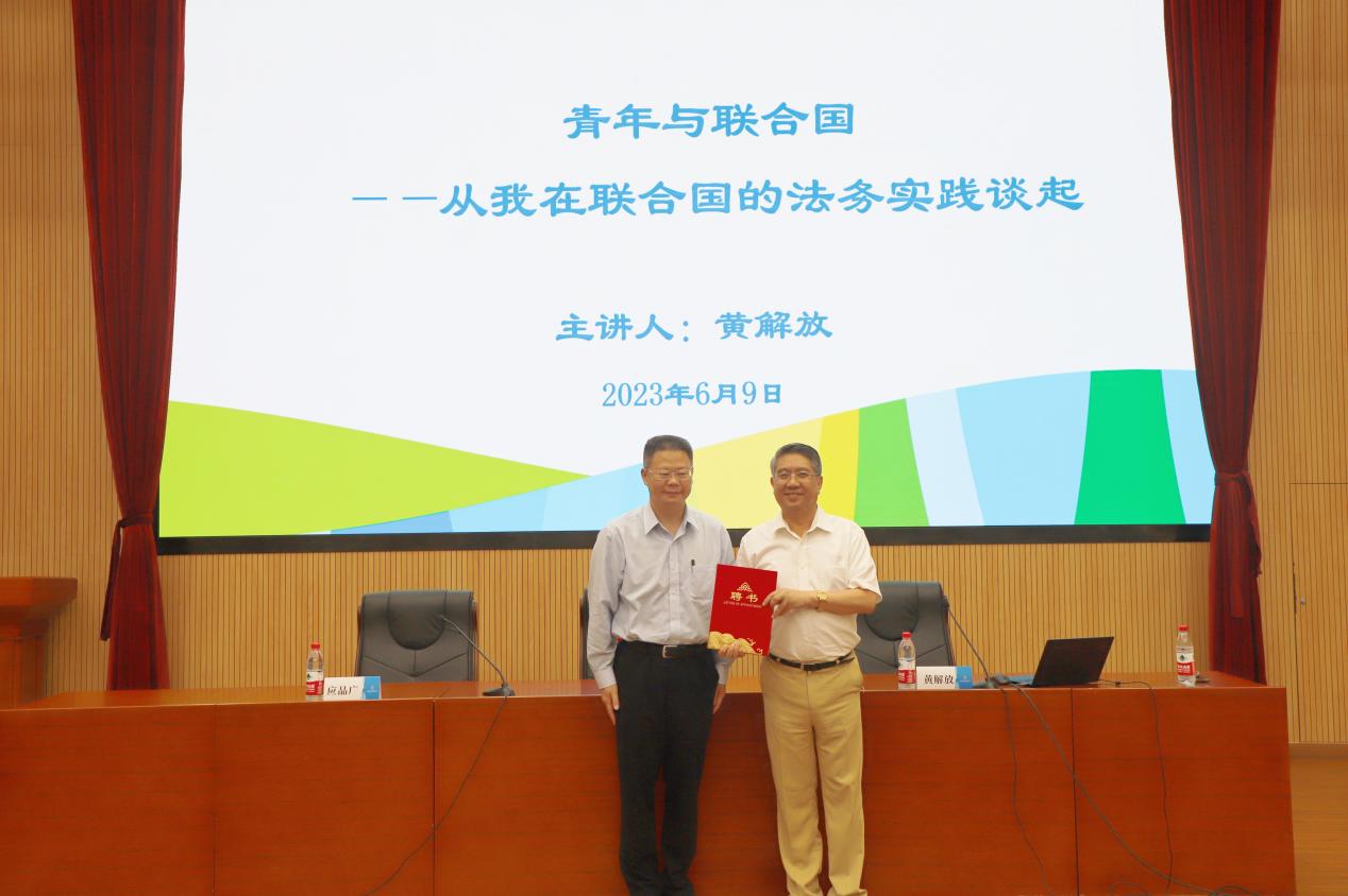 聘任仪式结束后,黄解放为我校师生作主题为“青年与联合国:从我在国际组织的法务实践谈起”的专题报告。他首先从联合国系统组织和职能、以及联合国秘书处人员构成等方面向大家简要介绍了国际组织特别是联合国的概况。