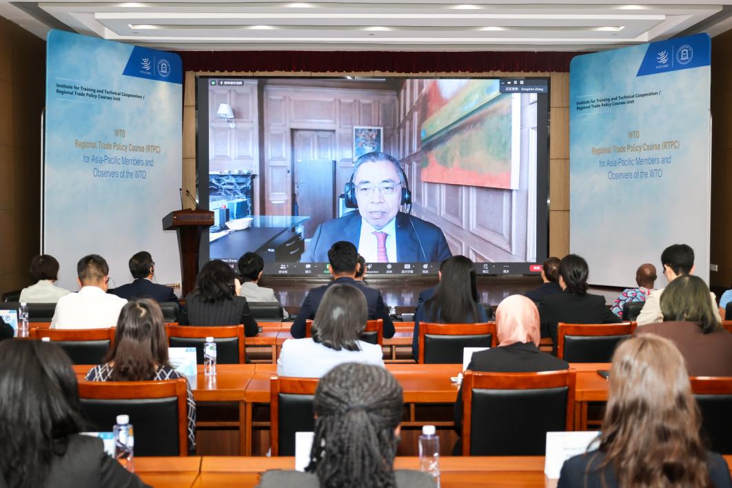 5月13日,世界贸易组织亚太成员和观察员区域贸易政策课程(RTPC)开班仪式在上海对外经贸大学古北校区举行。世贸组织副总干事张向晨通过线上方式为开班仪式致辞。商务部世贸司司长韩勇,世贸组织培训与技术合作司区域贸易政策课程处处长Vonai MUYAMBO,世贸组织培训与技术合作司区域贸易政策课程处培训官员Lissette NONALAYA ARANDA,上海市商务委员会副主任、一级巡视员张国华,浙江省人民政府驻上海办事处党组书记、主任蔡永波,上海对外经贸大学党委书记祁明,上海对外经贸大学党委副书记、纪委书记章益国,上海对外经贸大学WTO亚太培训中心主任黄建忠等出席开班仪式。