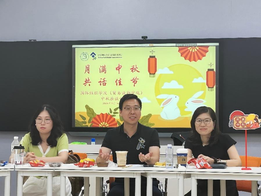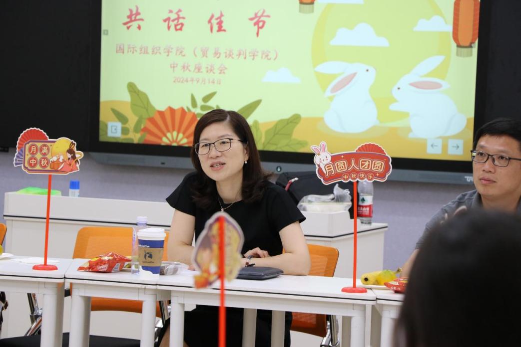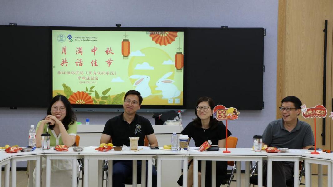 9月14日中午,在中秋佳节即将到来之际,国际组织学院(贸易谈判学院)在信息楼213研讨室举行师生中秋茶话会。学院党委书记刘素贞,院长应品广,党委副书记程栋,教师鲁斯齐、王元昆、辛雅文、郭歌,与2024级本硕新生代表齐聚一堂,共同庆祝传统佳节,共话理想与未来。座谈会由程栋主持。