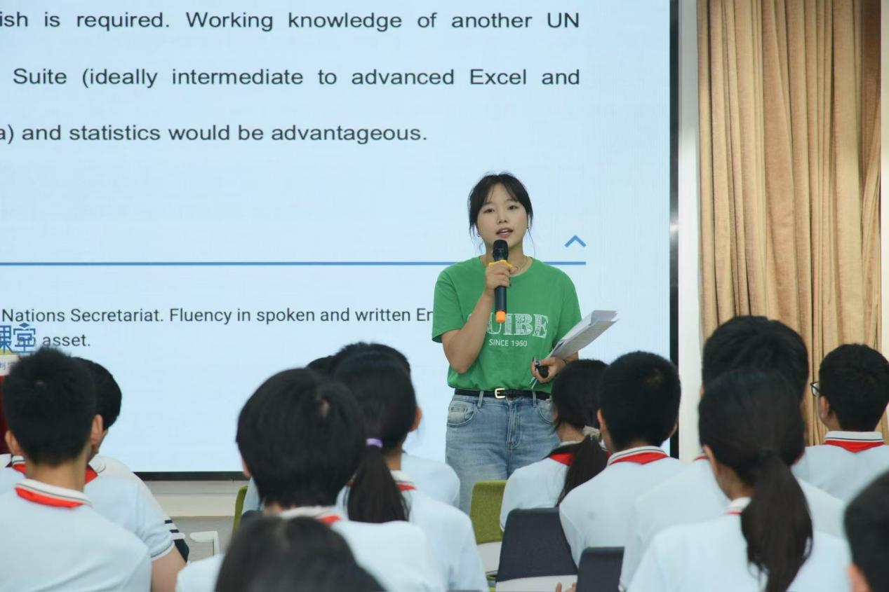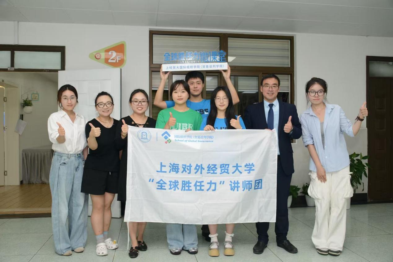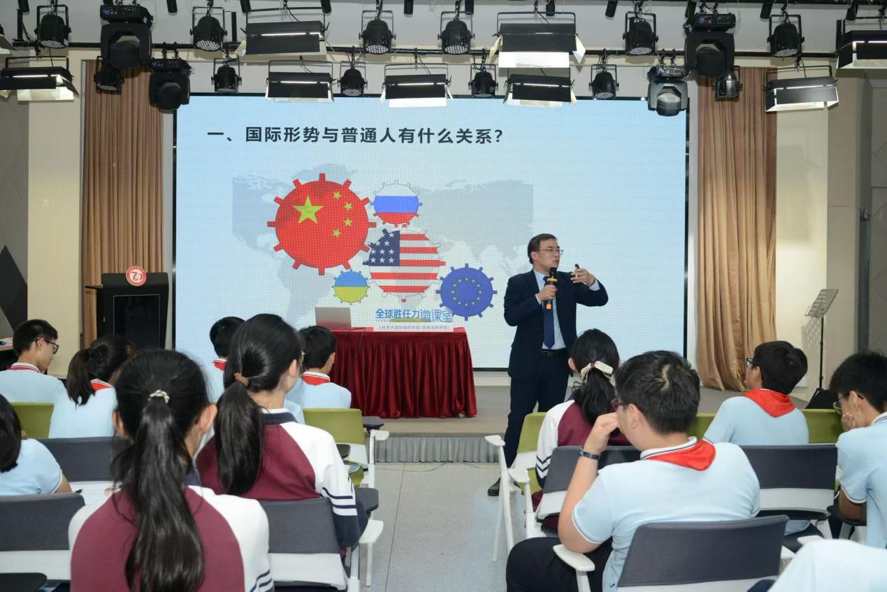 6月27日,上海对外经贸大学“全球胜任力”讲师团走进黄浦区卢湾中学,为七年级全体学生开设全球胜任力主题系列启蒙课程。本次讲师团由国际组织学院(贸易谈判学院)胡勇、卢琦老师,国际经贸规则专业杨亦萌、经济学(国际经济组织人才实验班)黄钰滔和国际商务外语学院英语笔译研究生陈明月同学组成,围绕国际形势与格局、国际组织运作、全球胜任力提升与青年责任等内容,引导初中生初探全球治理的广袤天地。