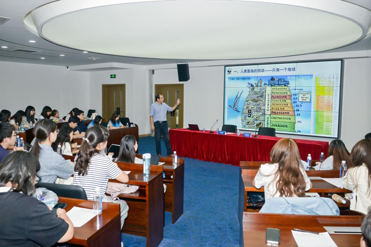 当天下午举办主题活动月首场活动,任文伟做客“国际组织与全球治理大讲堂”第23讲,为师生开设“世界自然基金会(WWF)全球及中国保护战略——兼谈国际组织在中国生态文明建设中的作用及定位”讲座。讲座由国际组织学院(贸易谈判学院)副院长王瑞领主持。