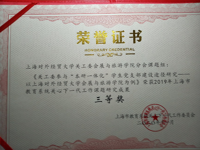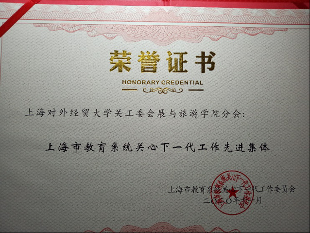 会议对上海市教育系统关心下一代工作委员会先进集体和先进个人进行了表彰。其中,我校封福海同志获上海市教育系统关心下一代工作终身荣誉奖;李邦君同志获上海市教育系统关心下一代工作先进工作者称号;钱洁同志获上海市高校优秀特邀组织员称号。我校会展与旅游学院关工委分会获上海市教育系统关心下一代工作先进集体称号;我校统计与信息学院关工委分会获上海市教育系统基层“五好”关工委组织称号。