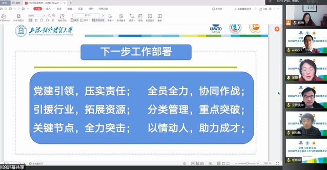 “对于毕业生来说,就业是最大的民生问题”。为了应对新冠疫情和严峻就业形势的叠加影响,切实做好2022年毕业生就业促进工作,3月28日下午,会展与旅游学院在线召开了“2022届毕业生就业工作专题调研推进会”。学校党委副书记吴毅、就业指导中心李蕾老师应邀出席,学院领导班子全体成员、教工党支部书记、系主任、学院办公室主任、学工办主任、毕业班班主任、辅导员及毕业生代表参会,会议由院长王春雷主持。