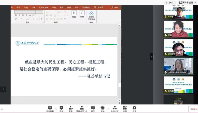 李蕾老师详细介绍了学校2022届毕业生就业工作进展情况,从供需结构、就业进度、毕业生就业心态等方面分析了当前就业形势,并就学院如何切实做好就业促进工作提出了指导性建议。