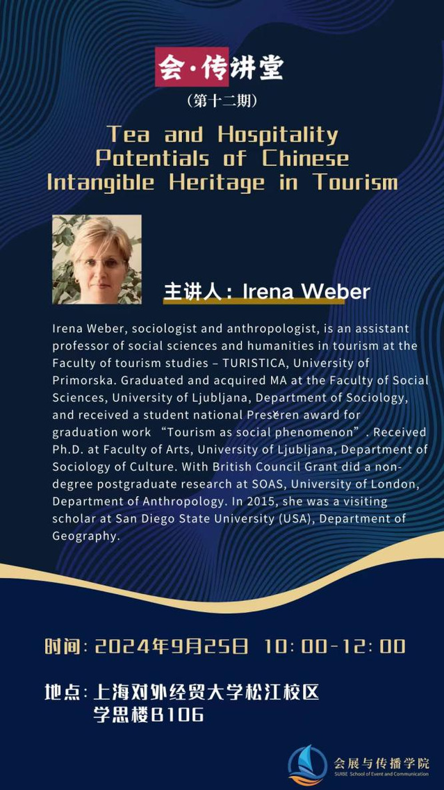 为积极搭建国际学术交流平台,培养具备全球视角与创新精神的高层次人才,会展与传播学院于9月25日上午邀请普利莫斯卡大学Irena Weber助理教授带来题为《Tea and Hospitality Potentials of Chinese Intangible Heritage in Tourism》的专题讲座。旅游管理学硕和MTA专硕研究生线下参加,本次讲座由张兆琨博士主持。