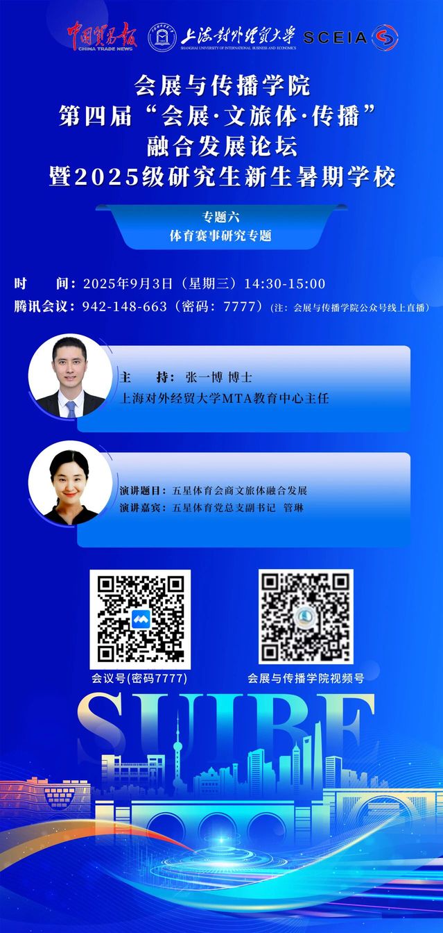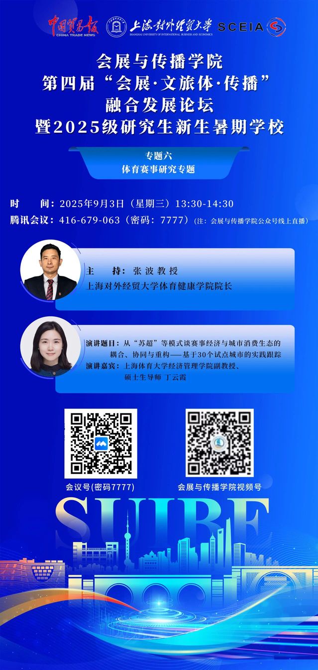 9月3日,由上海对外经贸大学、《中国贸易报》社和上海市会展行业协会联合主办,会展与传播学院、校研究生院、体育健康学院和长三角会展研究院联合承办,五星体育传媒有限公司协同举办的2025第四届“会展·文旅体·传播”融合发展论坛暨2025级研究生新生暑期学校的融合发展论坛板块“专题六:体育赛事研究专题”在线顺利举行。上海体育大学经济管理学院副教授、硕士生导师 丁云霞,五星体育党总支副书记管琳担任两场主旨演讲嘉宾。论坛分别由上海对外经贸大学体育健康学院院长张波教授、MTA教育中心主任张一博博士担任主持。