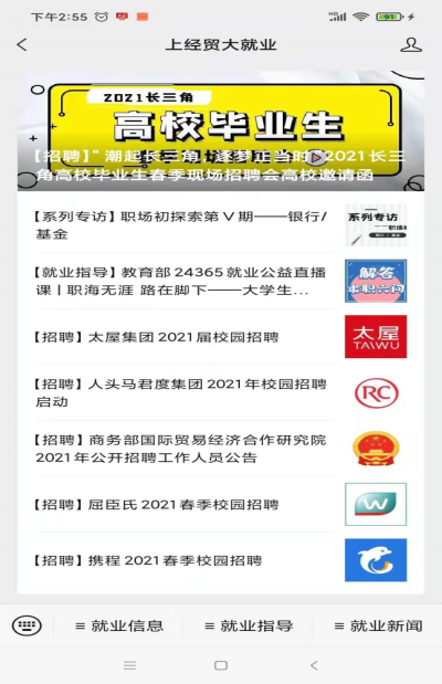 面对依然严峻的2021年整体就业形势,学生处整合优势力量,打出了“组合拳”,用多种方式开源拓岗。学校主动对接国家战略,开拓就业市场,先后与海南自贸港、大湾区和G60科创走廊等衔接,对接商务部以及国际组织实习,拓宽外省市级人社局,争取多渠道拓展各类行业与领域资源;充分利用“上经贸大就业”“上经贸大学生就业指导中心”微信公众号、24365及各高校共享的招聘资源;累计发布了29期“2021届毕业生招聘信息汇总”,34期“2021届知名企业招聘网申信息汇总”,提供了6200余个就业岗位。
