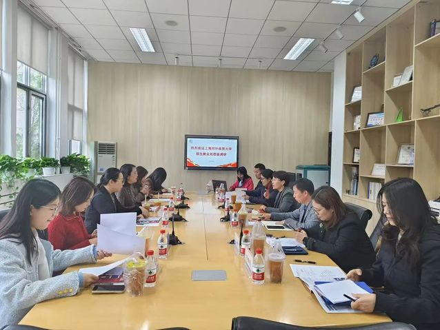调研第二站来到对外经济贸易大学。对外经济贸易大学招生就业处处长连英青、副处长朱庆、副处长史春辉、保险学院党委副书记刘莹及相关工作人员出席调研活动。对外经济贸易大学于2018年7月成立招生就业处,在本科招生和学生就业工作体制机制建设、“招生-培养-就业”联动等方面积累了丰富的经验,并形成了独具特色的做法。会上,调研团队详细了解了对外经济贸易大学在构建工作机制、拓展就业资源、开展就业宣传引导、打通“招培就”链条、优化招生宣传等方面的工作经验和特色做法。作为两所同样具有鲜明对外经贸特色的院校,双方还就当前招生就业工作面临的挑战与形势进行了深入研讨。