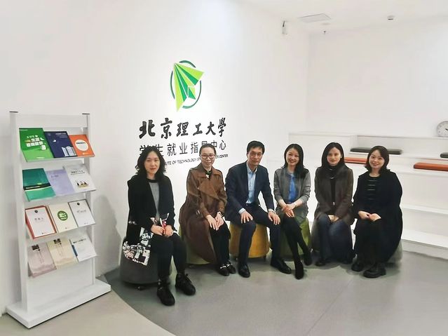 调研第四站来到北京理工大学。北京理工大学学生就业指导中心主任林骥佳和中心指导与培训部相关工作人员出席调研活动。北京理工大学在系统推进大学生职业生涯教育内涵发展方面具有深厚的积累和显著的特色。林骥佳详细介绍了学生就业指导中心的机构设置、人员队伍建设以及以“特色工作室”建设为牵引的精准化职业生涯教育工作体系建设情况。会前,调研团队参观了学校的大学生职业生涯教育主题空间和就业工作场馆。北京理工大学以学生需求为导向的“摆渡人”“职心”和“职美”三大特色工作室,国内高校首家“学生职涯体验中心”以及以本土化为目标的职业生涯教育理论研究和实践给调研团队留下了深刻的印象。