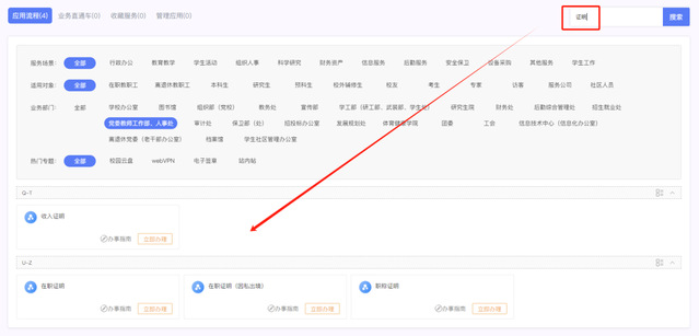 选择业务部门“党委教师工作部、人事处”或者搜索“证明”服务。