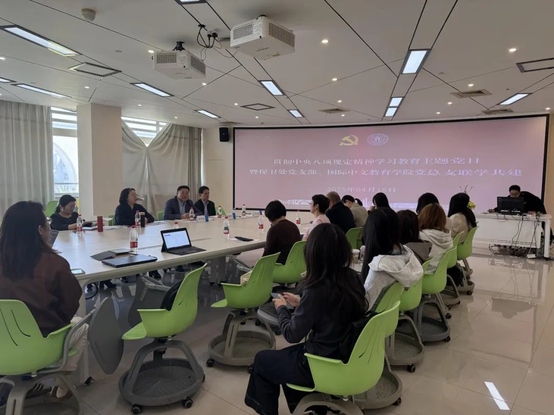 保卫处党支部走进国际中文教育学院,与学院师生党员开展理论联学。学院党总支书记邹囡囡以《深入贯彻中央八项规定精神,一体推进学查改》为题讲授专题党课,从历史脉络切入,结合典型案例剖析作风建设 “红线”,强调 “八项规定是党员干部的行为标尺,必须常学常新、见行见效”。保卫处党支部书记、处长李少丹立足《习近平关于加强党的作风建设论述摘编》,系统阐释 “作风建设—肃纪反腐—民风引领”逻辑链条。他指出:“作为校园安全守护者,保卫处党员既要严守纪律底线,更要以优良作风提升服务效能,把‘安全防线’转化为‘民心工程’。”