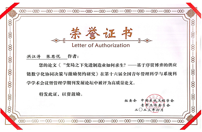 2023年6月17至18日,国际经贸学院洪江涛教授和研究生张思悦等4人受邀参加第十六届全国青年管理科学与系统科学学术会议暨管理学期刊发展论坛,并在分论坛七(物流与供应链管理)做题为《变局之下先进制造业如何求生?——基于序贯博弈的供应链数字化协同决策与激励契约研究》的学术报告。本次会议受到学界同仁广泛关注,共收到投稿论文300余篇,会议评选出21篇高质量论文,洪江涛教授和研究生张思悦合作的论文成功入选。