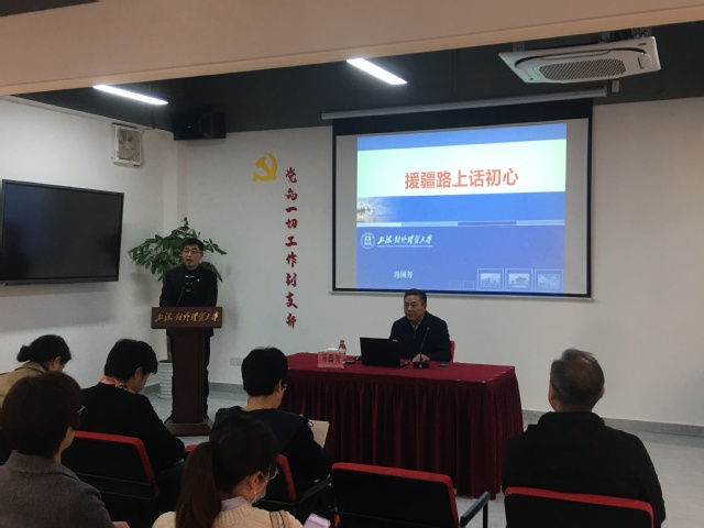 冯国芳教授以《援疆路上话初心》为题,通过大量的图片、文字、视频等材料生动的讲述了他在喀什大学援疆工作的经历和收获,党课内容分为“最是让人期待时”“发挥光热为初心”“克服困难援疆情”“英雄赞歌鼓舞人”四个部分,从援疆的背景、各级领导的关怀、课程和专业的引入与建设、英雄事迹的鼓舞等多方面分享自己援疆经历和体会,深入浅出的将一幅幅感人的画面呈现在党员眼前,让现场听众深受感染和教育。此次讲座给党员同志们带来的不仅是感动,更多的是鞭策,是对未来工作和生活的一种思考。支部党员们纷纷表示援疆教师的坚韧精神是在默默奉献中实现自己的价值,我们要以此为榜样,结合工作实际,强化责任担当,不忘初心使命,将这种坚韧精神落地生根,积极投身于学校的各项事业发展中去。