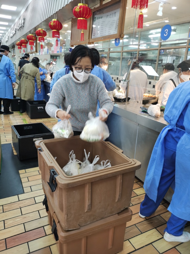 学校社区进入封闭管理状态后,学生一日三餐6000多份盒饭需配餐至宿舍,食堂急需校区老师支援。翟老师得知情况说,“我上”,在忙完研究生招生工作后,她又积极参加校内送餐服务保障工作。从4月11日开始,她每天6:30、10:30、15:30准时到食堂报到,负责学生社区A区配餐供应。她每天清点数量,协助打包运送,全力保供,为守护SUIBE贡献了一份微小但坚毅的力量。