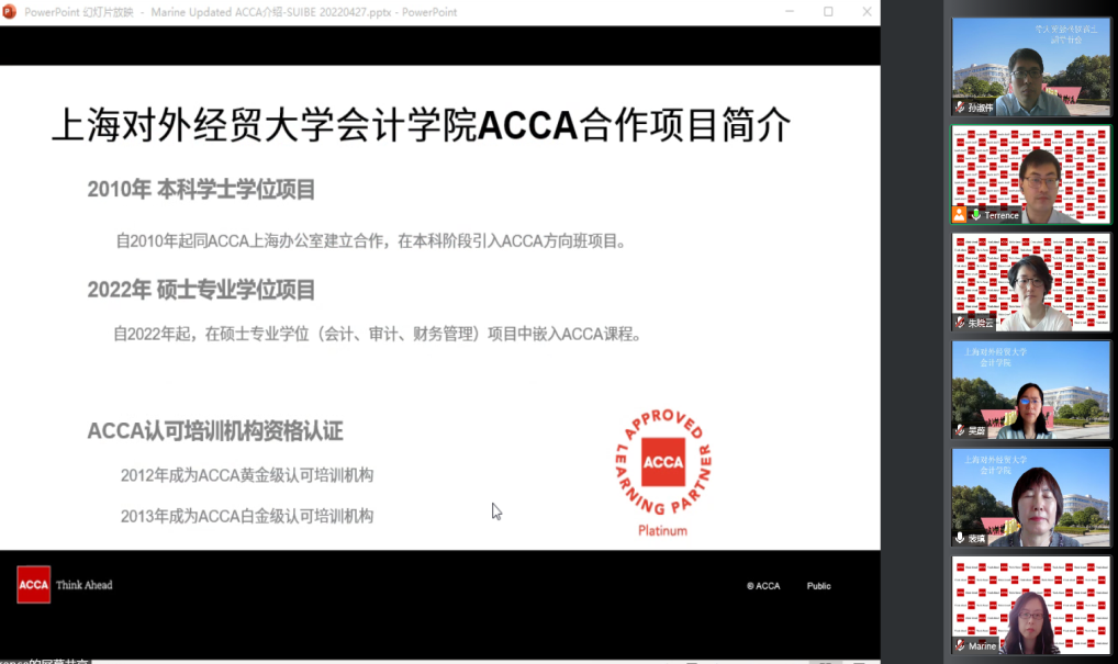 4月27日,裴瑱院长、孙淑伟副院长、吴蔚老师、曹亚楠老师以及ACCA华中地区负责人朱晓云女士等召开线上ACCA项目合作沟通会议。朱晓云女士主持了会议。ACCA上海办公室的Marine女士率先介绍了ACCA在全球和在中国的发展历史与现状,目前ACCA在中国已有会员和学员近19000人,认可雇主涵盖外企、国企、民企350余家,目前已是在全球认可度很高的专业组织机构。