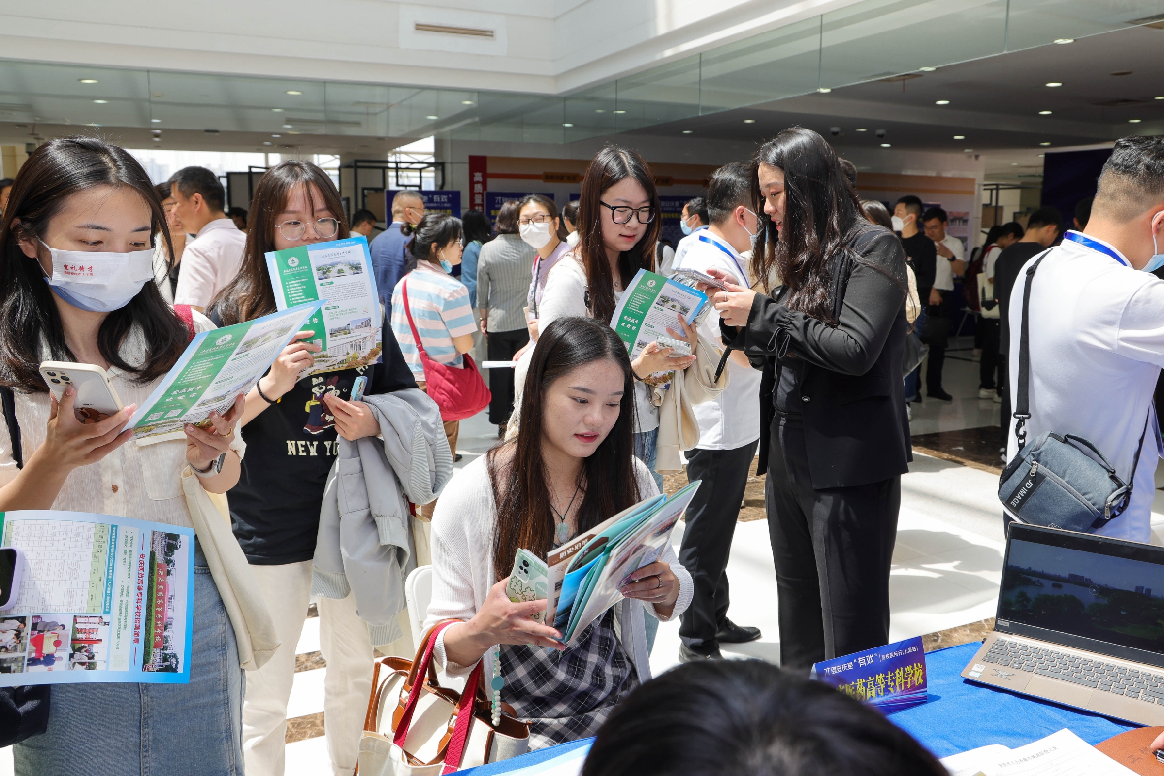 仪式后的主题招聘会上,安庆市属高校、国有企业、重点企业等30多家单位带来近千个优质岗位,面向毕业生进行现场招聘、政策咨询、面试洽谈。来自上经贸大以及上海交通大学、东华大学、上海理工大学等多所高校的毕业生到场参加“双选会”,市、校相关领导参与巡场。