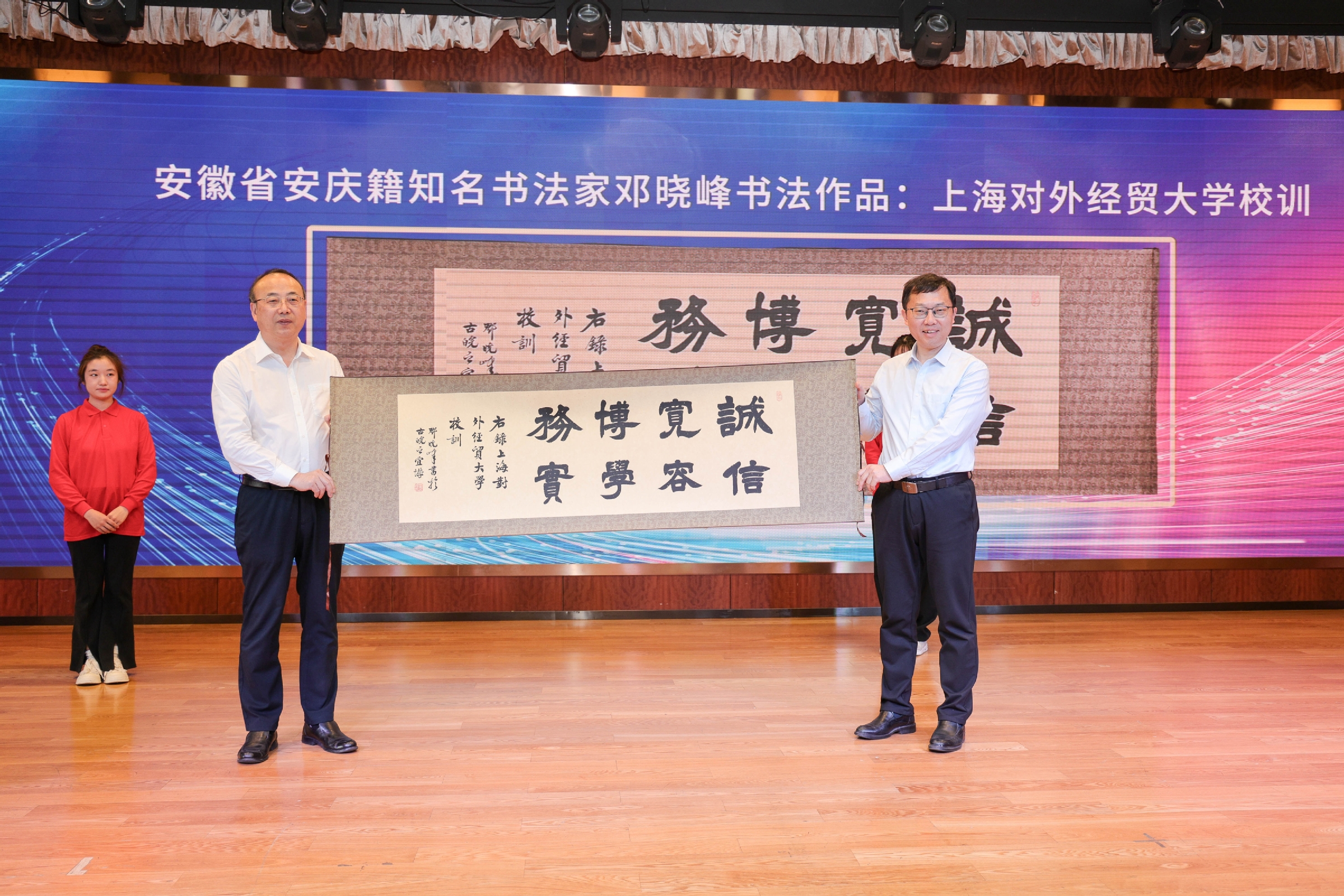 仪式上,张祥安向学校赠送了别具匠心的书法作品:“诚信、宽容、博学、务实”的校训字样,从清代安庆籍篆刻家、书法家邓石如的碑刻中拓写,作者邓晓峰是邓石如的后人、邓稼先的堂侄、安徽书法家协会会员。