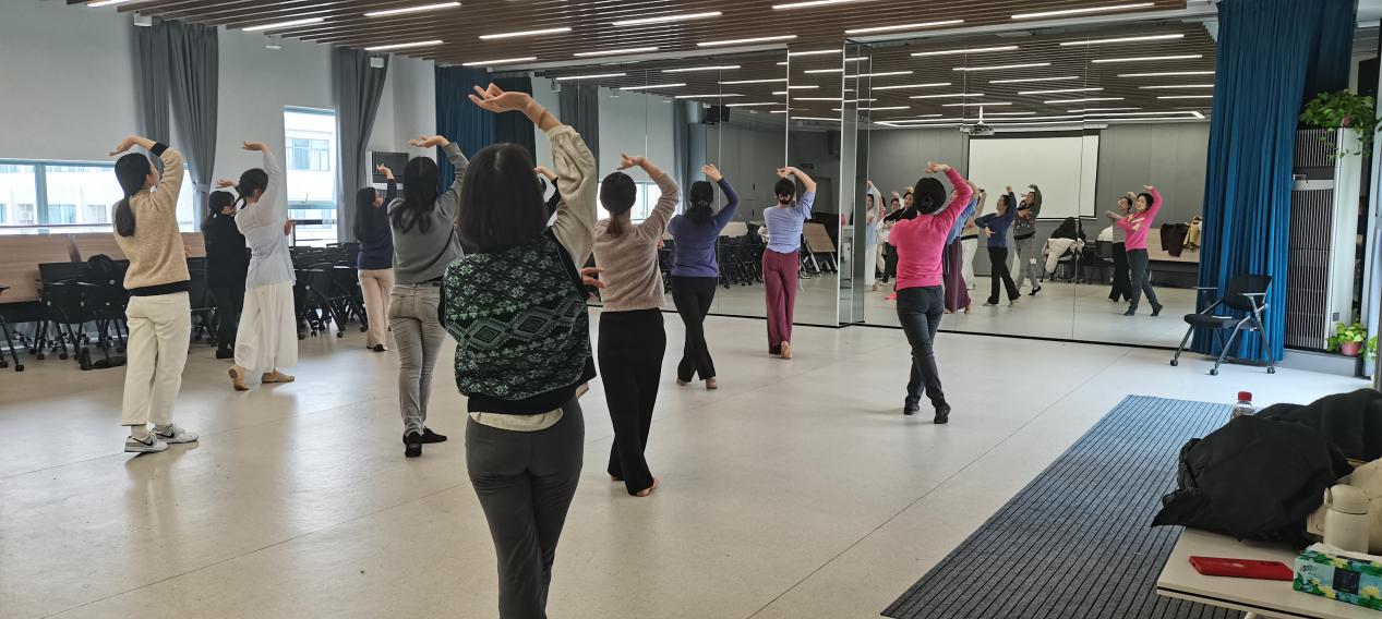 民族舞培训班让教职工们初步认识身韵的形、神、劲、律及呼吸运用,不仅提高了身体的柔韧性与协调性,而且也加深了对民族舞美学原则的理解,更对以舞传情的神情意致有了进一步的感悟。