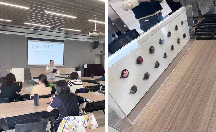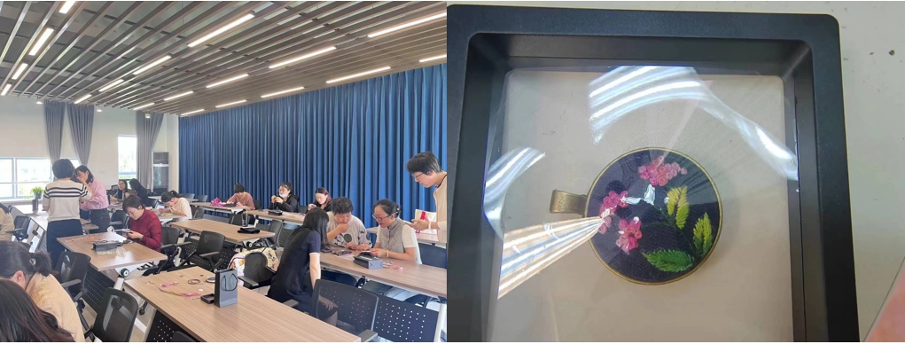顾绣体验课活动邀请了顾绣传承人担任讲师,为大家带来了一次难忘的手工艺术之旅。传承人首先向大家介绍了顾绣的历史渊源和文化内涵,让大家对这一传统手工艺有了更加深入的了解。她详细讲解了顾绣的基本针法和制作技巧,包括平针、随形针、套针等多种针法的运用,以及刺绣图案的设计和构图原则。在传承人的指导下,教职工们按照步骤一针一线地绣制着图案,大家绣出了一个个精美的图案,既有传统的韵味,又不失现代的气息。