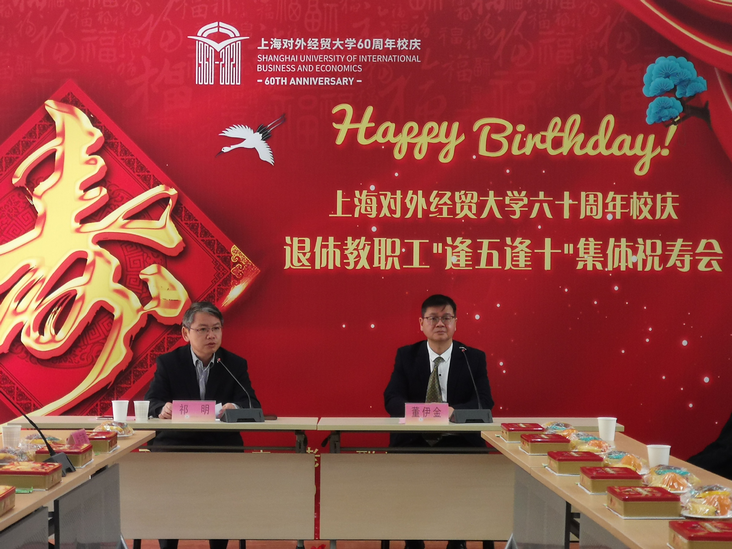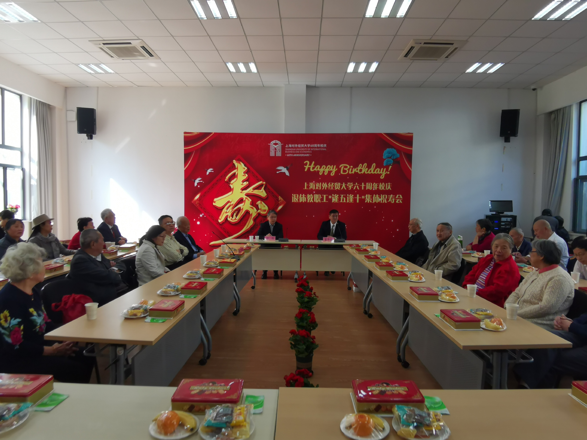 10月30日, 2020年退休教职工“逢五逢十”集体祝寿会在古北校区举行。校党委副书记、副校长祁明出席祝寿会,并代表学校党政领导班子向寿星们致以诚挚的祝福。2020年“逢五逢十”退休教职工有96位,54位出席祝寿会。本次祝寿会由离退休党委书记、老干部办公室主任董伊金主持。