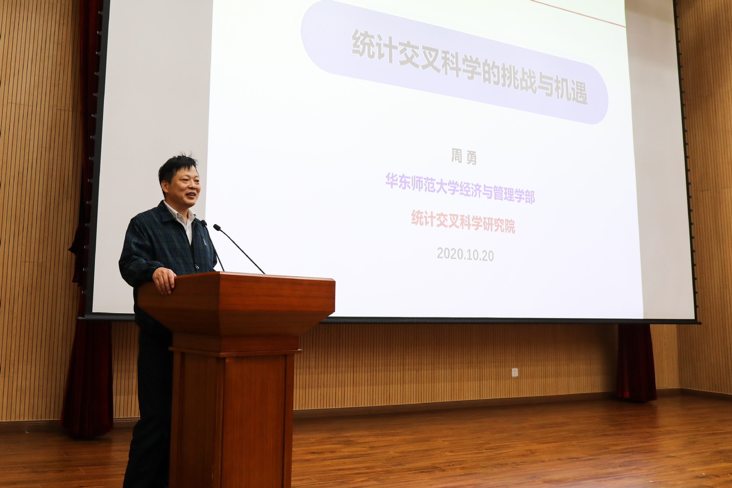 揭牌仪式结束后,周勇教授作了“统信大学堂”首场报告《统计交叉学科的挑战与机遇》。他结合典型案例,生动形象地阐明统计学在促进多学科融合上发挥着越来越重要的作用,同时提出交叉科学融合与发展必然给统计学带来重要的机遇及挑战。周勇教授通过介绍统计学与大数据行业等时代前沿信息,为同学们展示了不一样的领域知识,在扩展同学们知识面的同时,增强了同学们努力学好统计学的信心。
