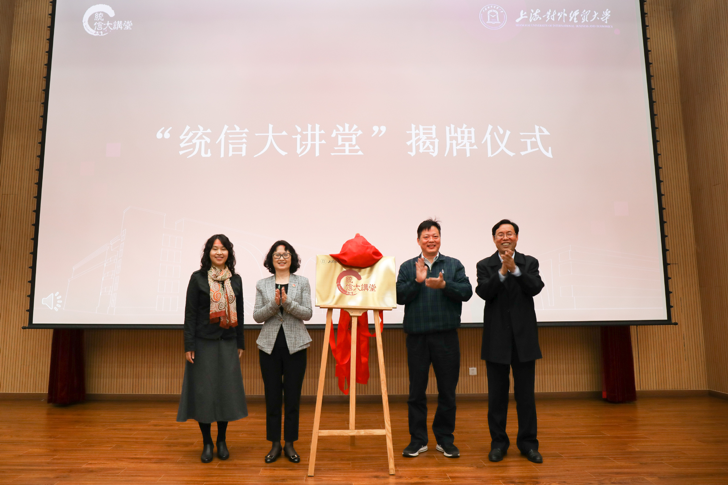 会上举行了揭牌仪式,陈洁、周勇、王群、刘永辉共同为“统信大讲堂”揭牌。