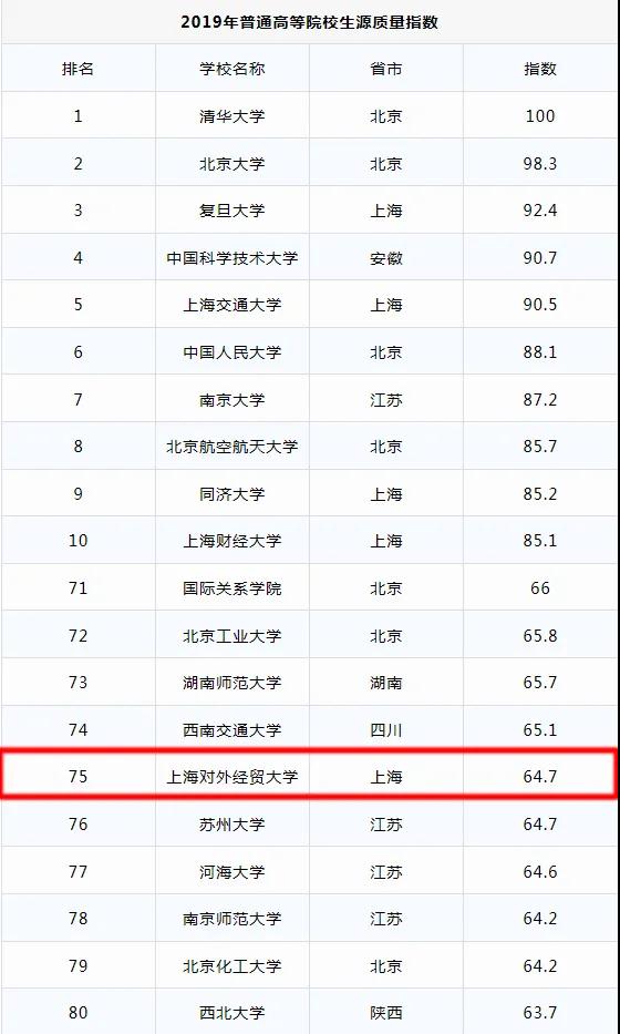 中国大学生源质量排行榜根据内地高校与各省市录取分数最低分和平均分统计,统筹考虑提前批次、所在地区生源等影响因素,科学计算得出。入选生源质量百强的绝大多数为“双一流”高校,仅15所非“双一流”高校上榜,我校位列第9名。