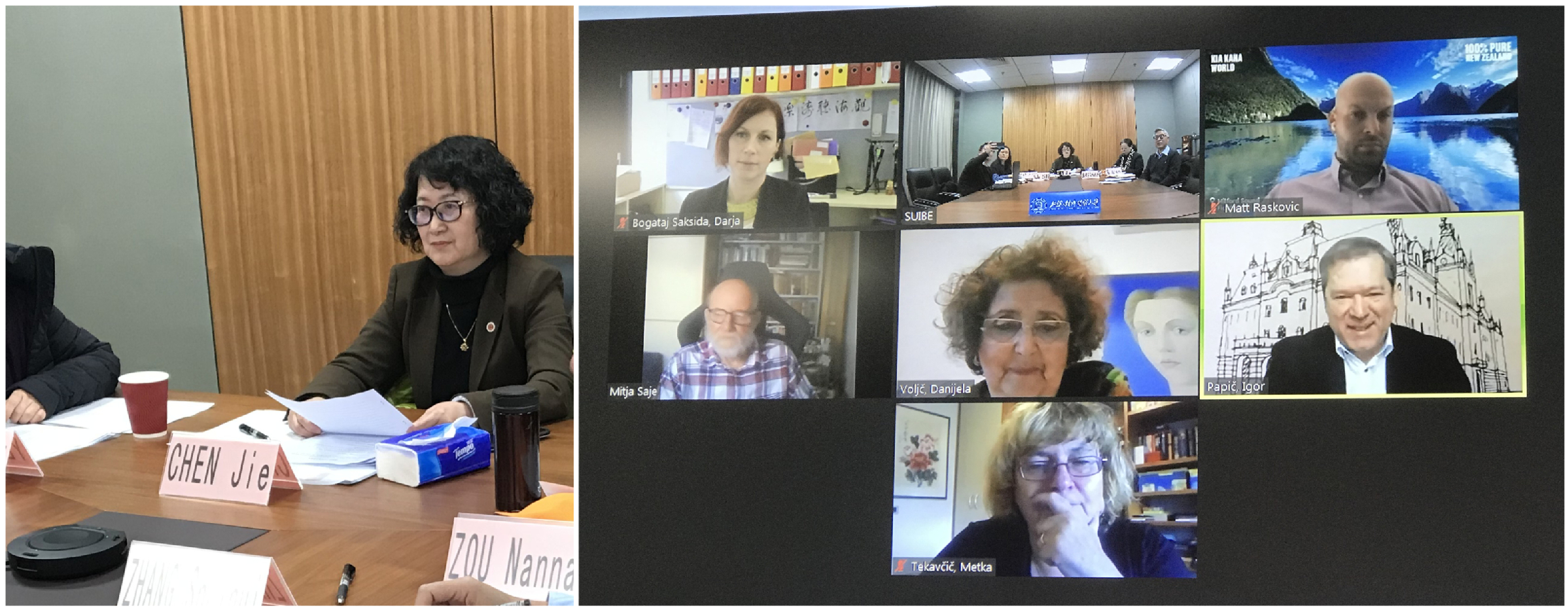 在校长双边会谈结束后,2020年度卢大孔院理事会正式召开。卢大校长Igor Papic、卢大经济学院院长MetkaTekavcic、卢大文学院汉学教授MitjaSaje、惠灵顿商学院教授MatevzRaskovic、卢大孔院外方院长DanijelaVoljc、卢大孔院项目经理DarjaSaksidaBogataj和我校副校长陈洁、外事处处长兼孔子学院办公室主任邹囡囡、孔子学院事务协调人叶蓉教授以及外事处副处长张水辉、孔子学院办公室行政秘书袁自立等出席了理事会。