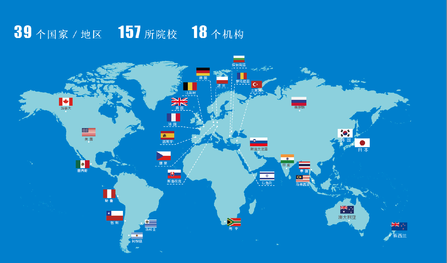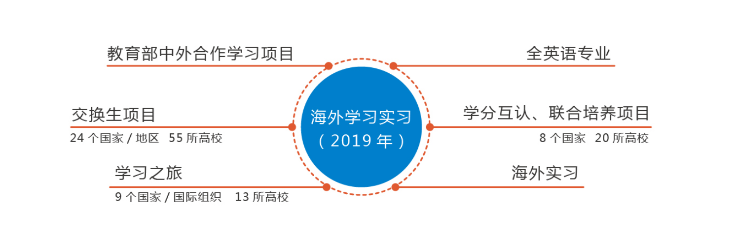 学校始终坚持教育国际化发展理念,持续开展中外合作办学项目,着力开辟国际合作交流渠道,建立集人才培养、师资互聘和科研合作于一体的国际化协同平台。目前,学校已与国(境)外近40个国家/地区的150多所大学或机构建立了合作关系,合作范围跨越全球五大洲,合作渠道广阔,合作层次丰富。学校先后加入有国际影响力的区域性和全球性高端国际教育战略联盟9个,与WTO等国际组织的合作日益密切;以国际认证为突破口,跻身国际精英教育联盟,会展专业、旅游专业、金融工程、金融学、会计学专业等均已获得权威教育或行业组织国际认证;建立3所孔子学院、1个孔子课堂,其中1所孔子学院获“全球先进孔子学院”称号。