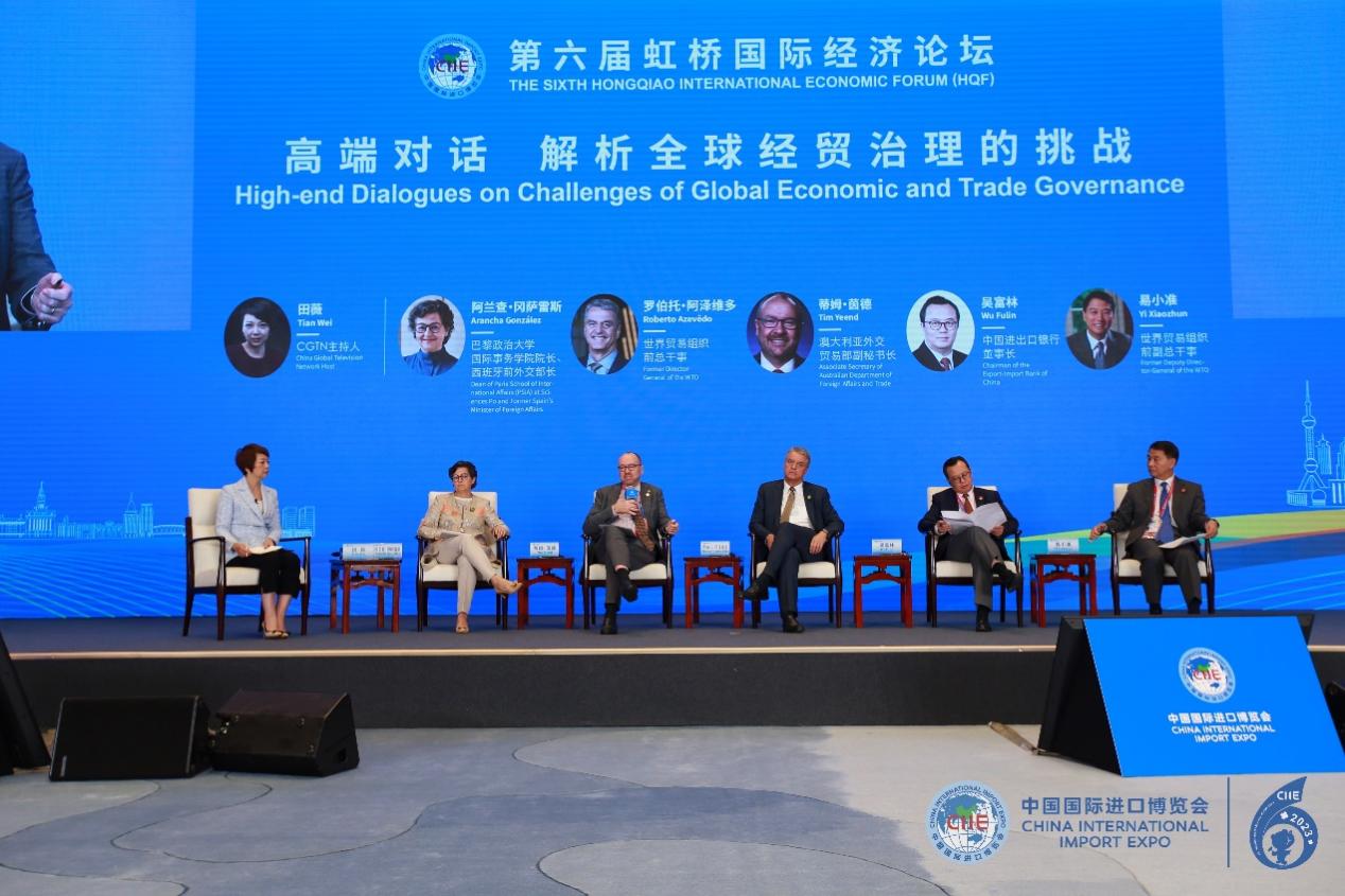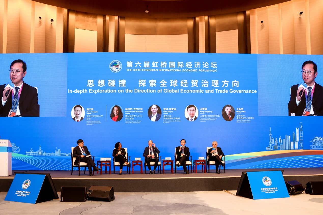 11月6日上午,由商务部主办,对外经济贸易大学、上海对外经贸大学和上海WTO事务咨询中心承办的第六届虹桥国际经济论坛“坚守多边贸易体制 完善全球经贸治理”分论坛在国家会展中心(上海)成功举行。商务部副部长凌激发表主旨演讲,澳大利亚贸易和旅游部长兼特别国务部长Don Farrell发表视频演讲,巴黎政治大学国际事务学院院长,西班牙前外交部长AranchaGonzález、世界贸易组织前总干事Roberto Azevêdo、澳大利亚外交贸易部副秘书长Tim Yeend、国际贸易中心(ITC)执行主任Pamela Coke-Hamilton、世界贸易组织前副总干事易小准、中国进出口银行董事长吴富林、澳大利亚阿德莱德大学教授Peter Draper、上海WTO事务咨询中心理事长王新奎、对外经济贸易大学校长赵忠秀、上海对外经贸大学校长汪荣明、CGTN主持人田薇等嘉宾出席分论坛并发言讨论。