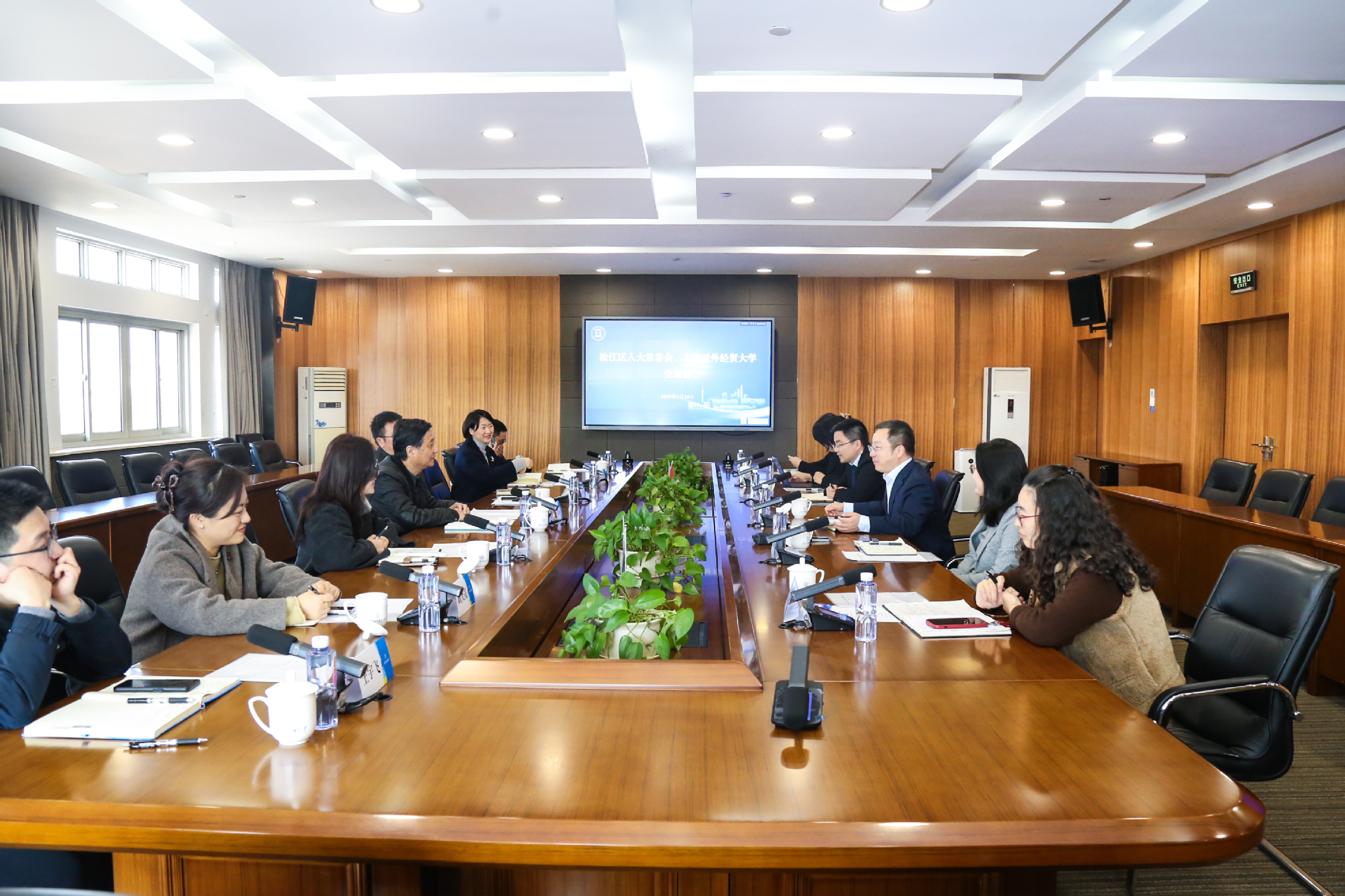 许复新对学校在服务松江区域经济社会发展方面做出的贡献表示感谢。希望学校继续做好对重点人才的关心培养,以建设松江大学城与地区合作示范区为契机,发挥学校资源优势,加强区校联动,加大产学研合作,创新地校协同育人,赋能共建促发展。