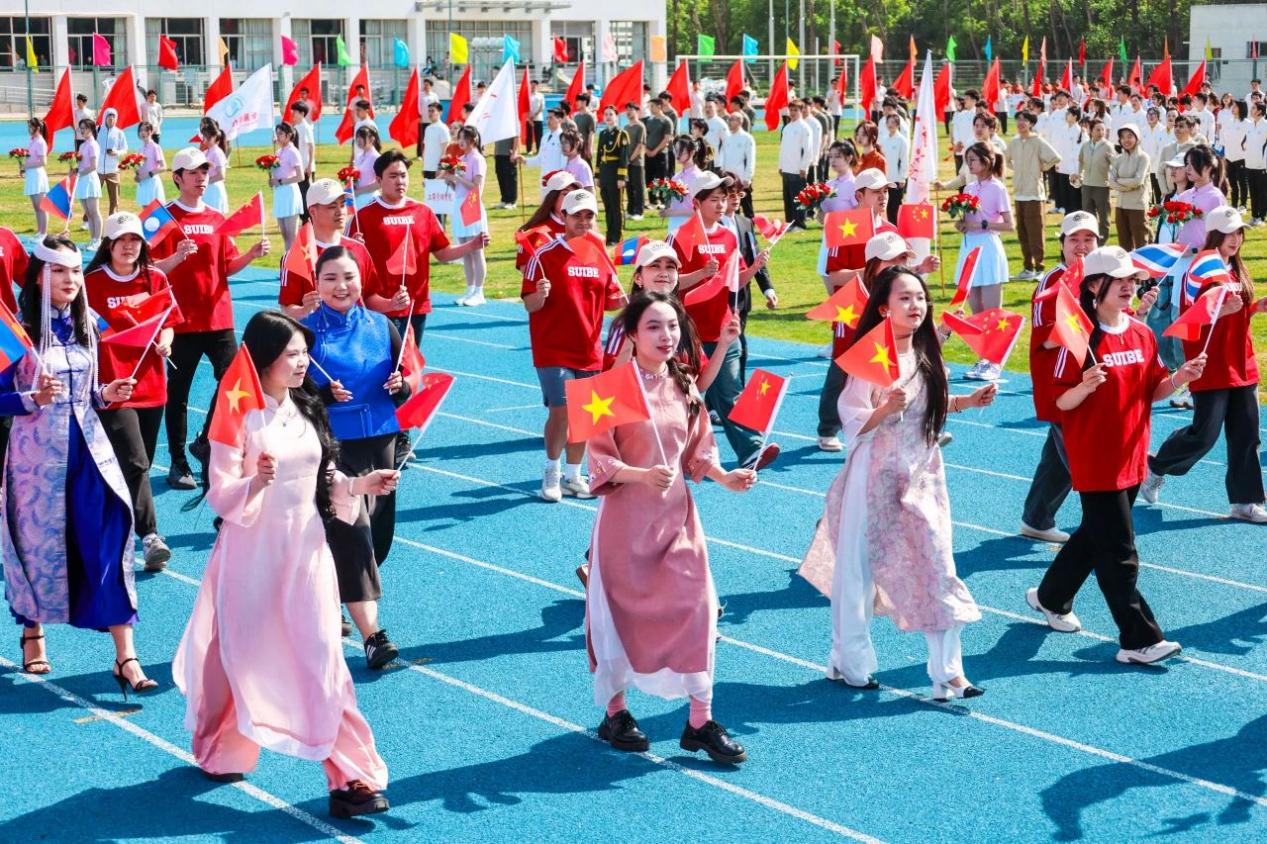 校党委书记祁明宣读《强体健心促进计划》,并宣布“上海对外经贸大学第 28 届运动会开幕”。一时间,红旗方阵挥旗成浪,鲜花方阵欢呼如潮,“生在红旗下,长在春风里”的表演将开幕式推向高潮。