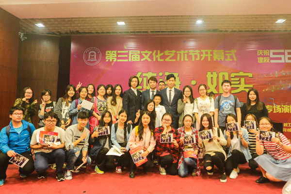学校特邀上海跨界演唱组合“力量之声”进行“纯净•如实”专场演出。“力量之声”组合由毕业于上海音乐学院声乐歌剧系的三位青年歌唱家宋罡、余笛、王志达组成,他们以专业的音乐素养、磅礴的气势和振奋人心的节奏让全场观众直呼过瘾。“力量之声”组合为师生倾情奉献了其代表作《我们的上海》以及多首经典中英文歌曲,他们优美的歌声使现场观众听得如痴如醉。本场演出高潮迭起,在“力量之声”组合特别为纪念长征胜利80周年献唱的歌曲《红旗飘飘》中圆满落幕。