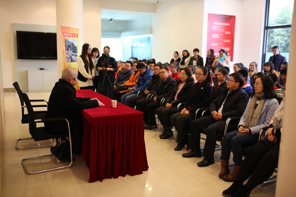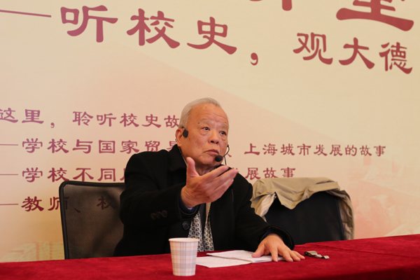 在一个半小时的讲述中,81岁高龄的封福海老院长回顾了他与“外贸”的不解之缘,回顾了学校发展历史进程中师生在破解物资、财政等各种困难时,体现出的自强不息、攻坚克难的精神,回顾了他在推进学校课程改革过程中的精彩故事。他多次提到“创业艰难、道路曲折”,告诫师生们不能忘记历史,强调一定要“不忘初心,继续前进”。他说,随着中国经济的发展,国际地位的不断提高,当今国家和社会对经贸人才的需求越来越强烈,我校更要培养国际化的经贸人才,使学生在外语强、业务精的同时,具有国际视野。他希望同学们能继承和发扬“诚信、宽容、博学、务实”的校训精神,秉持爱国之心,全面提高个人素质与能力,为母校争光,为上海的发展作贡献。