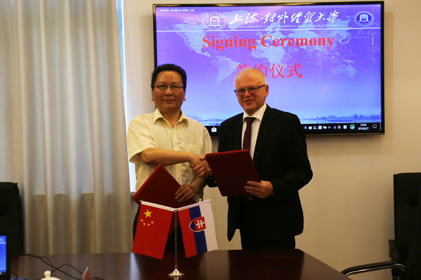 6月8日上午,校长朱国宏在古北校区会见了来访的斯洛伐克布拉迪斯拉发经济大学校长Ferdinand DAŇO教授、分管国际交流事务的副校长Boris MATTOŠ副教授等一行3人。会谈结束后,朱校长与该校校长Ferdinand DAŇO教授签署了合作谅解备忘录。会议由国际交流处处长邹囡囡主持。我校中东欧研究中心代表、国际经贸学院车春鹂副教授等参加了会谈及签约仪式。