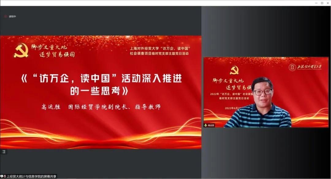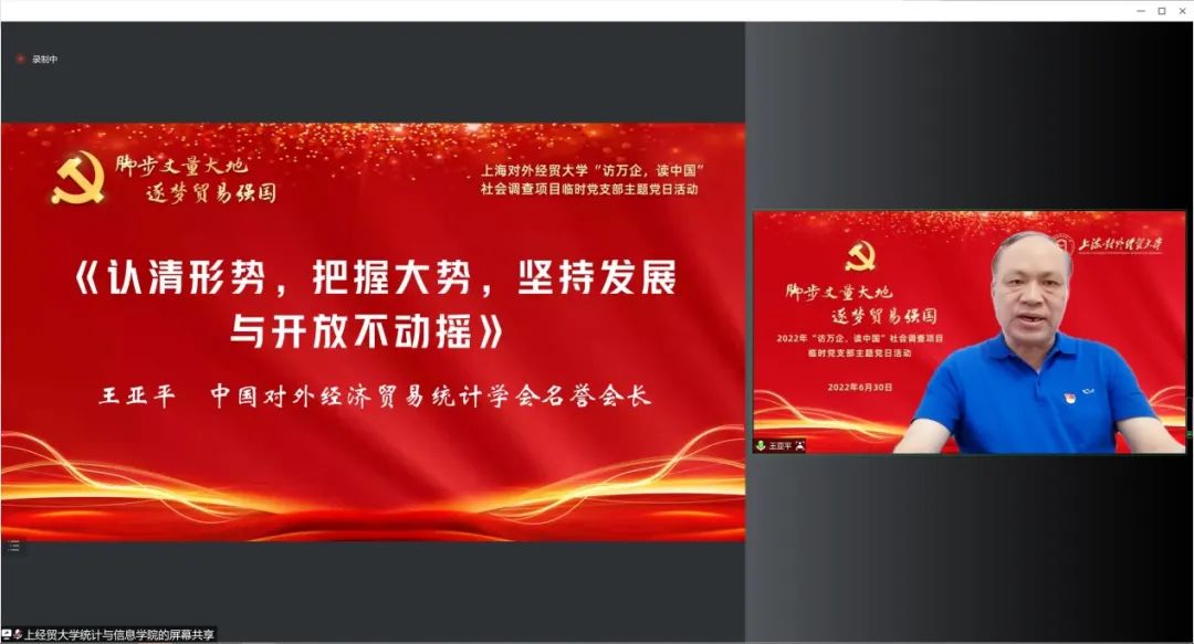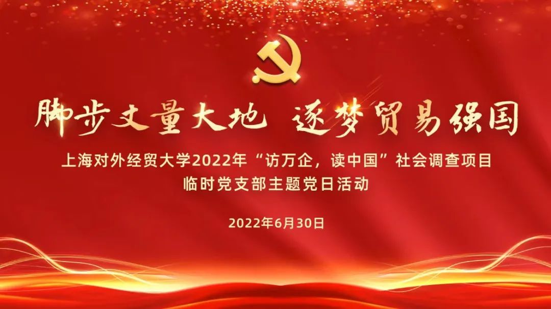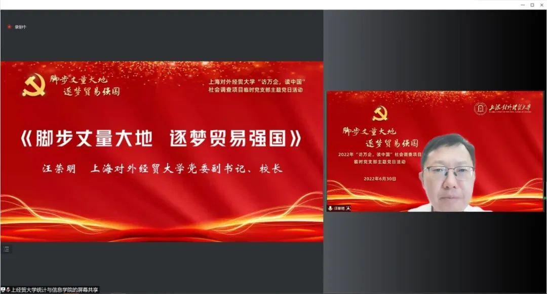 为迎接党的二十大胜利召开,深入学习贯彻上海市第十二次党代会精神,在建党101周年来临之际,6月30日下午,上海对外经贸大学2022年“访万企,读中国”社会调查项目临时党支部在线开展主题党日活动,以“脚步丈量大地 逐梦贸易强国”为主题邀请校内外专家开设专题党课,激励参与调查项目的师生牢记嘱托、砥砺奋进,以党建领航助推“访万企,读中国”社会调查项目取得高质量成果。
