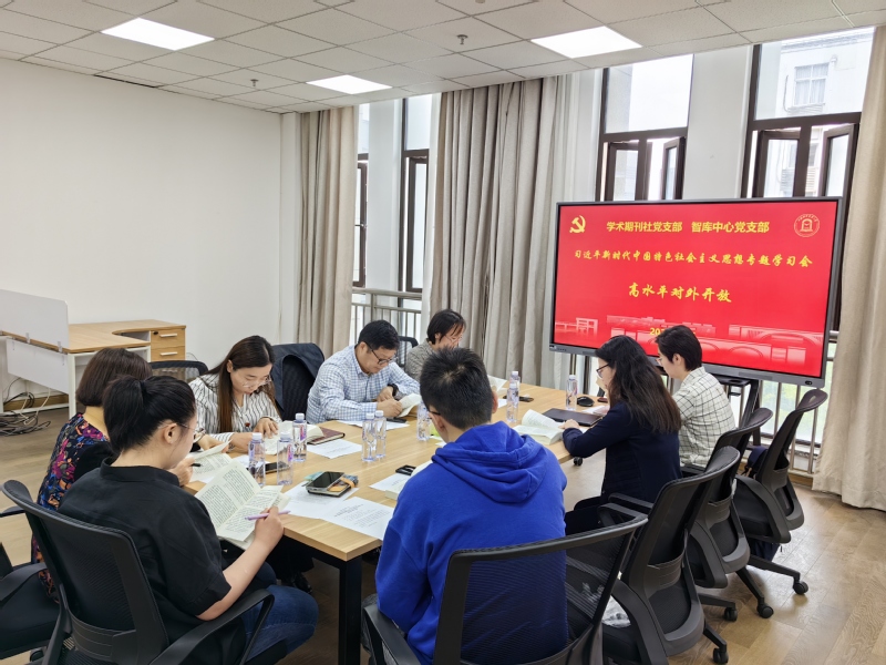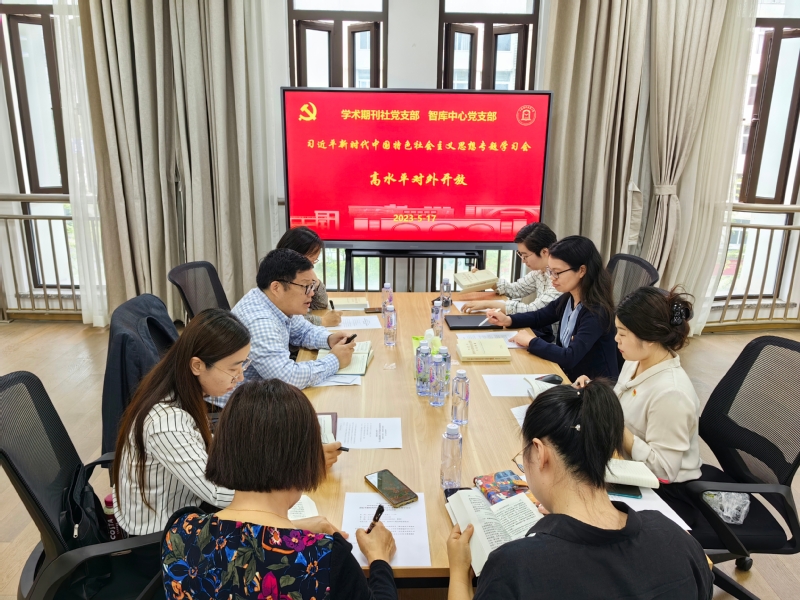 为深入学习贯彻习近平新时代中国特色社会主义思想主题教育,5月17日上午,学术期刊社党支部与智库中心党支部开展联组学习。本次联组学习主题为学习《习近平新时代中国特色社会主义思想专题摘编》高水平对外开放专题,由学术期刊社党支部书记高运胜教授主持。