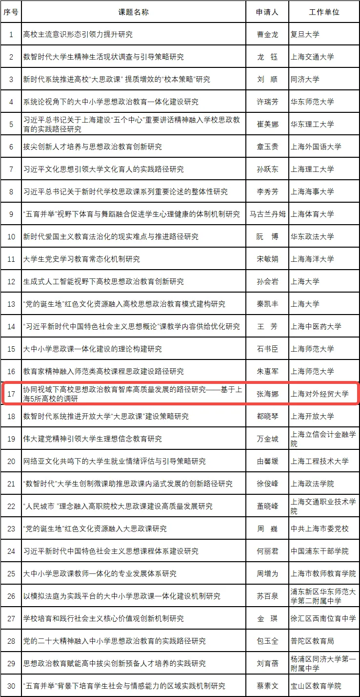课题动态|我院张海娜副院长获上海市哲学社会科学规划“学校思想政治教育研究”专项课题立项